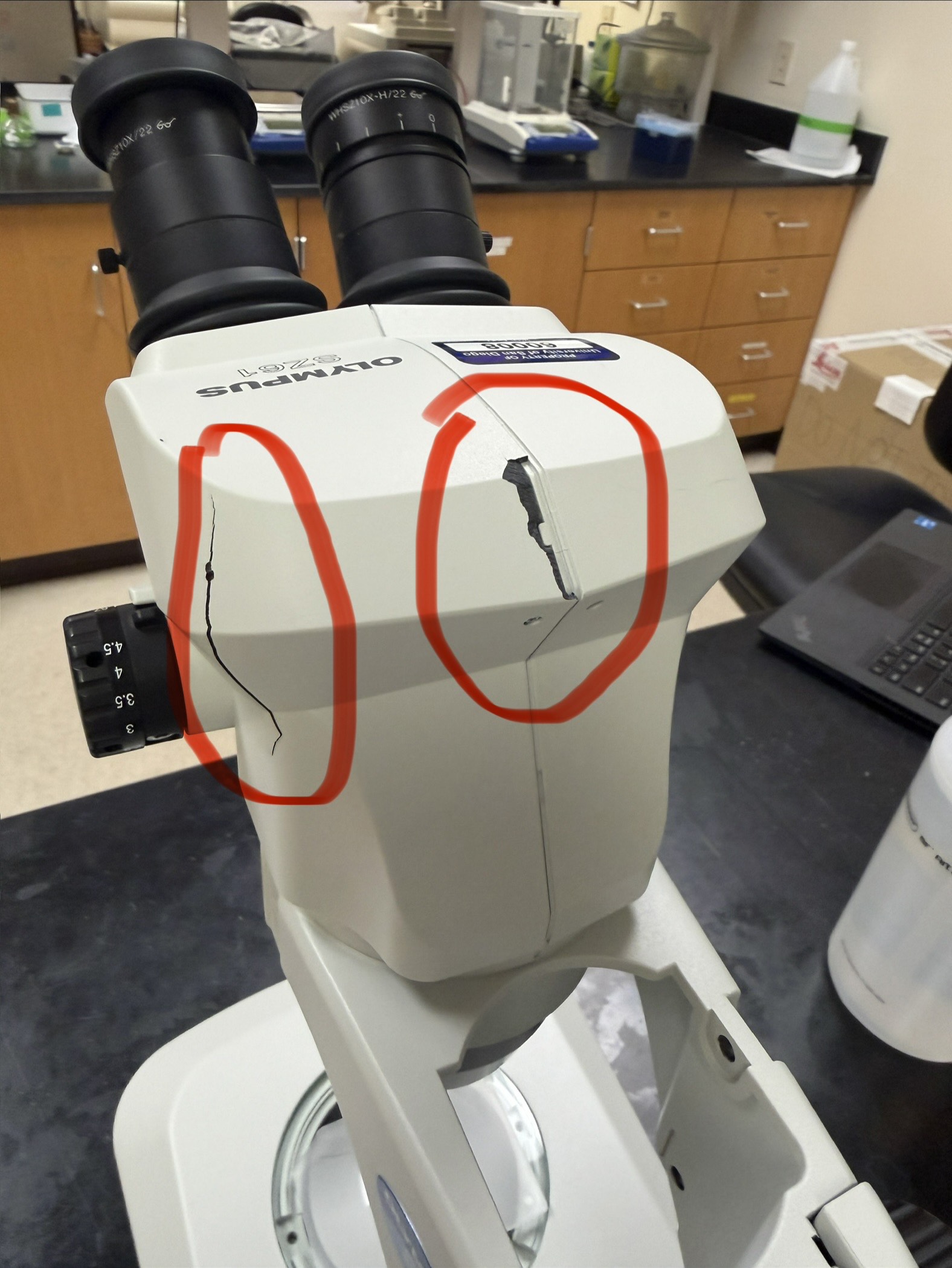 Hi everyone, We recently discovered a cracked dissecting microscope in ST327 with misaligned optics. It is now unusable, and the binocular replacement will cost over $1,500. To keep our labs running smoothly, please ensure your students are fully aware of their responsibility to handle these instruments with care. If damage does occur, please report it immediately rather than returning the unit to the cabinet. This allows us to address repairs before the next class is impacted. [image: IMG_9708.jpeg] Thank you, Angela Tin Ki "Angela" Tsang, Ph.D.*| *曾天琪 (she/her) Laboratory Technician, Biology University of San Diego 5998 Alcalá Park, SCST-368 San Diego, CA 92110 619-260-4843