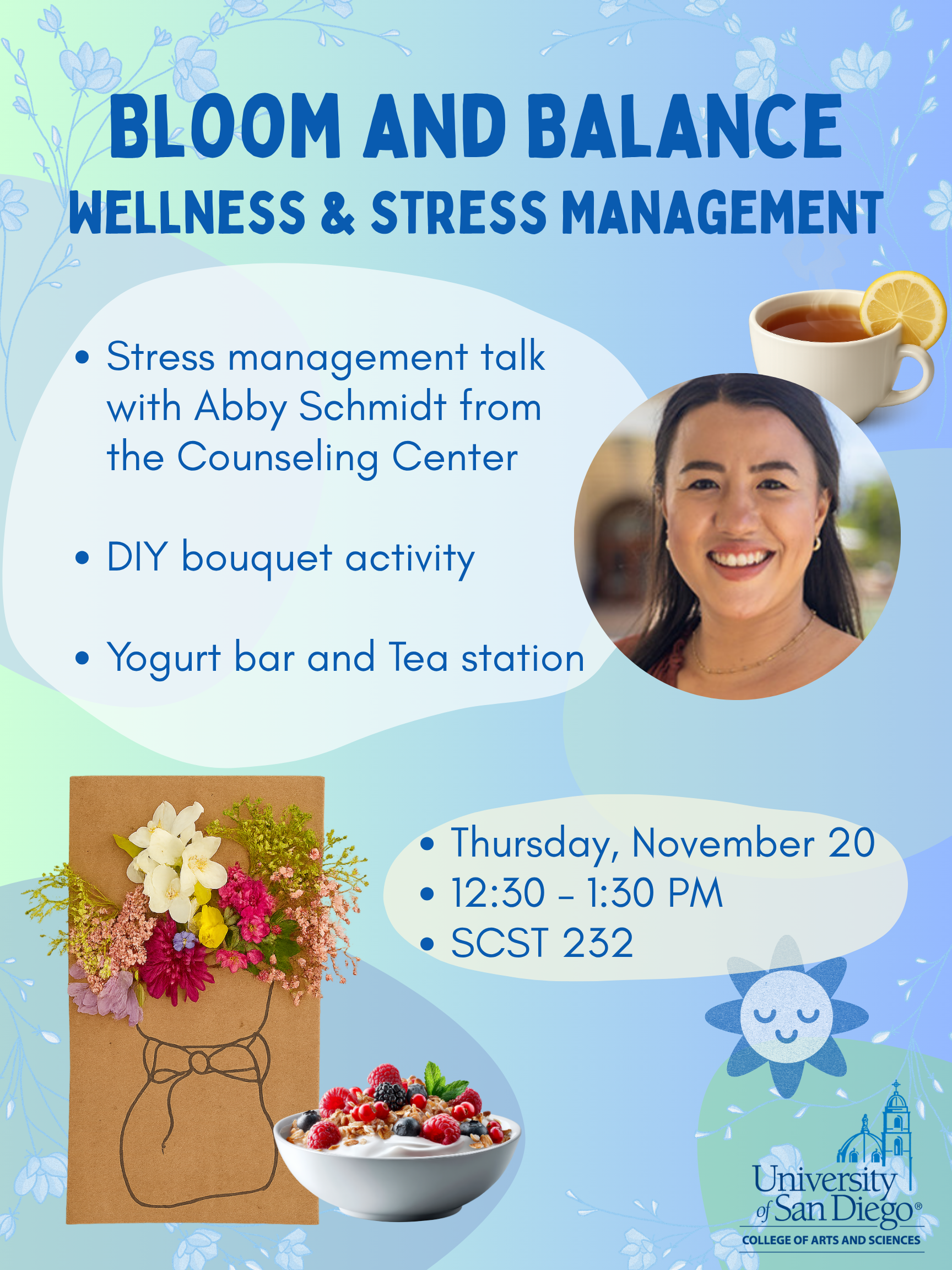 Hi everyone, Hope you are well! We are hosting a *"Bloom and Balance" wellness event *to give students a restorative mid-day reset next *Thursday (11/20) from 12:30-1:30pm in ST232* . It will feature: - A stress management talk by Abby Schmidt from the Counseling Center - A DIY bouquet activity led by the Bio Club - A yogurt bar and tea station Please share the attached flyer with your class and encourage your students to stop by. It's a great way for them to decompress and connect with each other. Thank you for your support! Take care, Angela -- Tin Ki "Angela" Tsang, Ph.D.*| *曾天琪 (she/her) Laboratory Technician, Biology University of San Diego 5998 Alcalá Park, SCST-368 San Diego, CA 92110 619-260-4843