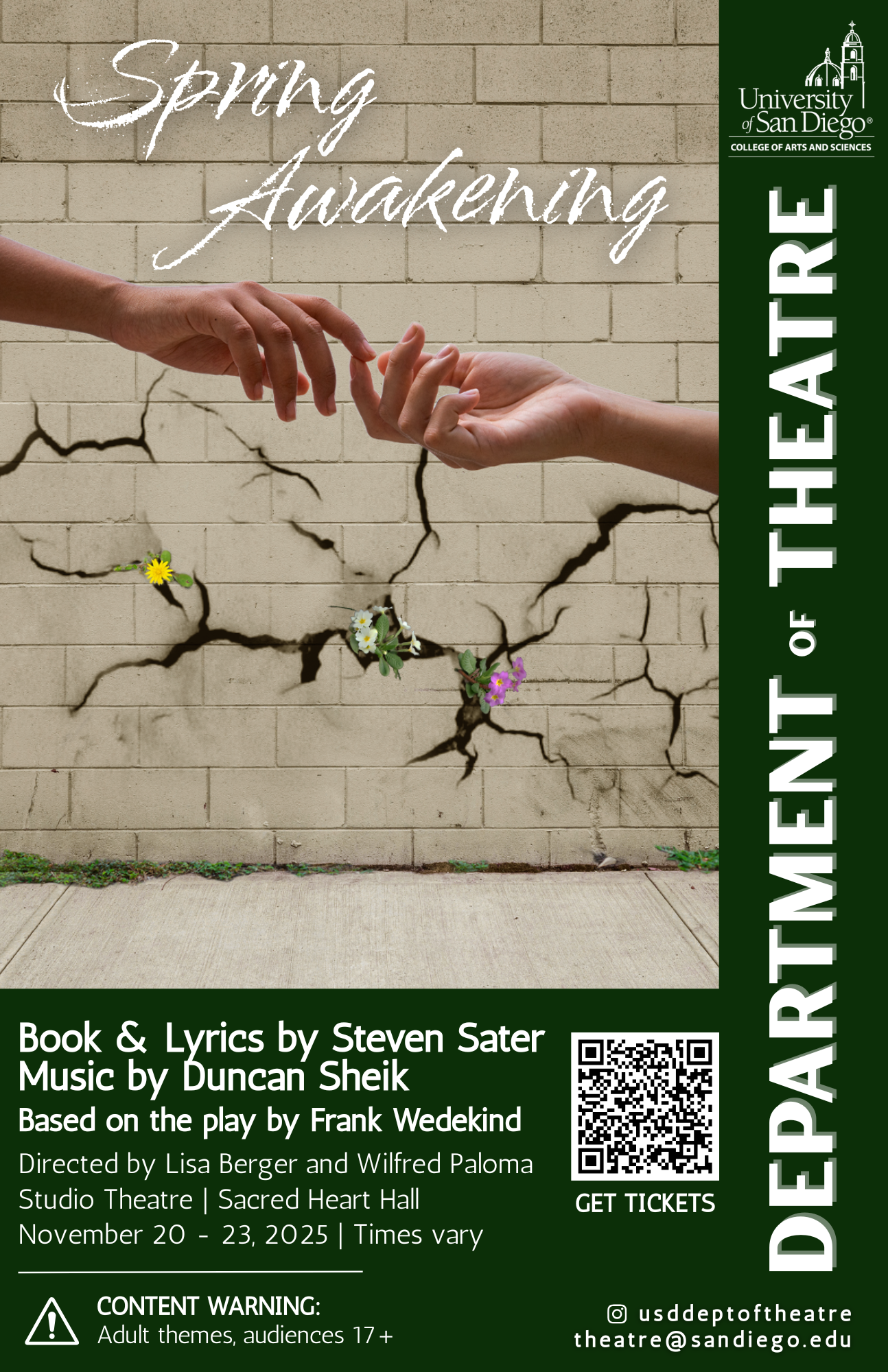 You are invited to attend the Department of Theatre’s fall production of *Spring Awakening*, with book and lyrics by Steven Sater and music by Duncan Sheik, directed by Adjunct Assistant Professor Lisa Berger and Postdoctoral Faculty Wilfred Paloma. *Synopsis* Set in 1891 Germany, the musical follows a group of students navigating adolescence without meaningful guidance from the adults around them. As Melchior, Wendla, and Moritz confront emerging desires, uncertainty, and the pressures of growing up, the story offers a powerful look at youth, repression, and resilience. *Location* Sacred Heart Hall, Studio Theatre *Performance Dates & Times* • Thursday, November 20, 2025 — 7:30 p.m. SOLD OUT • Friday, November 21, 2025 — 7:30 p.m. SOLD OUT • Saturday, November 22, 2025 — 2:00 p.m. • Saturday, November 22, 2025 — 7:30 p.m. • Sunday, November 23, 2025 — 2:00 p.m. *Accessibility* The Studio Theatre is accessible with no stairs at the entrance. Some seating requires climbing a few small steps. If you need assistance or ground-level seating, please contact us so we can accommodate you. *Content Advisory* Spring Awakening explores the rollercoaster of adolescence, touching on themes of sexual awakening, rebellion and struggles of coming of age. Due to its mature content, we recommend audiences of 17+. *Please note that no late seating will be provided.* We hope you will join us and support this production. [image: Spring Awakening.png] [image: Department of theatre.png] _______________________________________________ Collegestaff mailing list -- collegestaff@lists.sandiego.edu To unsubscribe send an email to collegestaff-leave@lists.sandiego.edu -- *Melanie Writer* Executive Assistant, Biology Department University of San Diego mwriter@sandiego.edu 619-260-4729
