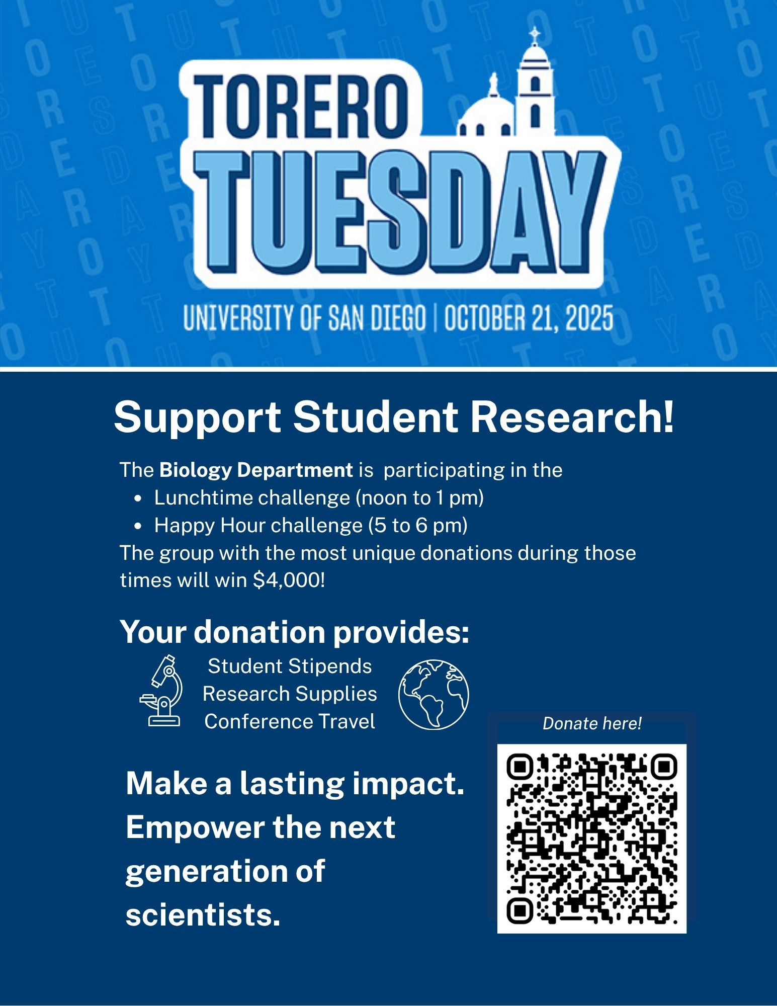 Dear Biology Students, Here is the information for supporting the Biology Department on Torero Tuesday! We are participating in both the *Lunchtime challenge from noon to 1 pm* and the *Happy Hour challenge from 5 to 6 pm*. The prize for winning a challenge is $4,000 - which is 2/3rds of a summer research stipend. The group with the most unique donations during the challenge wins (minimum donation is $10). Our goal is to be able to support more student research next summer. Thank you for your support! Thank you for sharing this message! [image: 2025 Torero Tuesday Flyer with Link.jpg] Best regards, *The Biology Department*