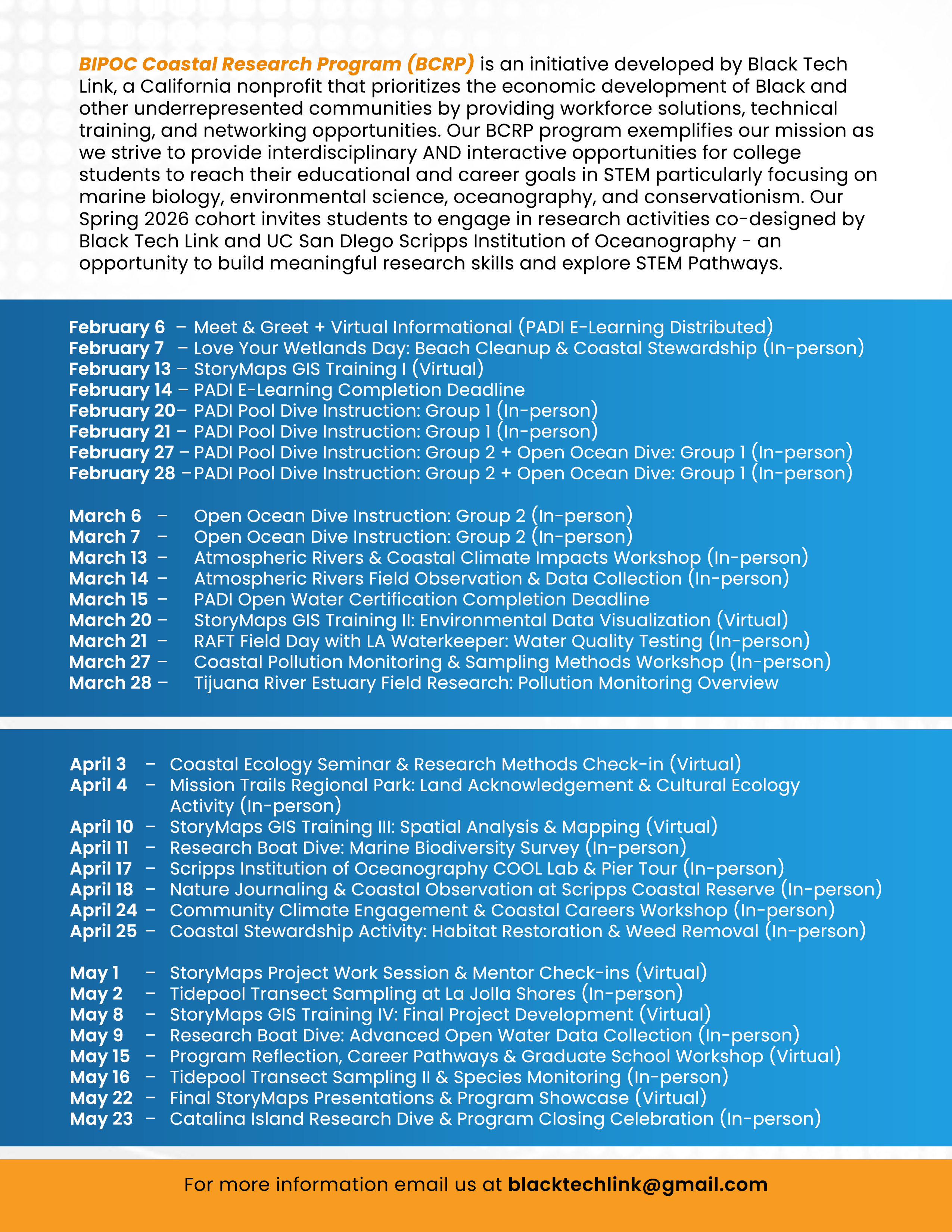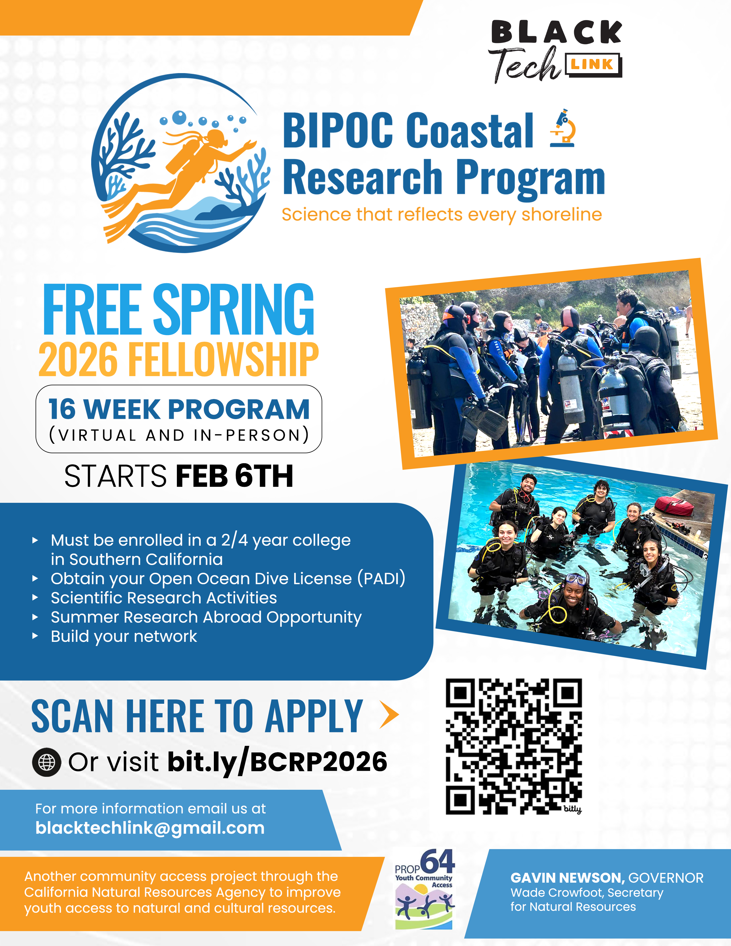 Dear Biology students, Please see the following information about a research mentorship opportunity. See you on campus next week! The Biology Department Black Tech Link is offering our BIPOC Coastal Research Program (BCRP) for Spring 2026! This 7-month mentorship opportunity is designed for college students pursuing careers in marine biology, environmental science, oceanography, and STEM related fields. Participants will gain hands-on experience, earn a free PADI certification, and network with leading researchers. Limited spots available! To apply visit https://blacktechlink.org/home/new-bipoc-program-page/. The deadline to apply is February 3rd.