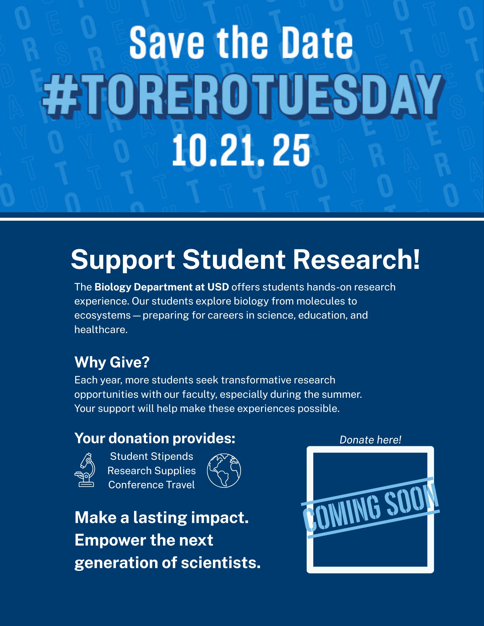 Dear Biology students, Happy Friday! On Torero Tuesday, the Biology Department is entering two of the challenge contests: the Lunchtime challenge from noon to 1 pm and the Happy Hour challenge from 5 to 6 pm. The group that has the most unique donations during the challenge wins the prize! The minimum donation is $10. We will send out the donation link on Monday (it's in our bio @usdbiology already). Thank you for your help in getting this message out! [image: 2025 Torero Tuesday Flyer (Real Estate Flyer).jpg] Thank you, The Biology Department